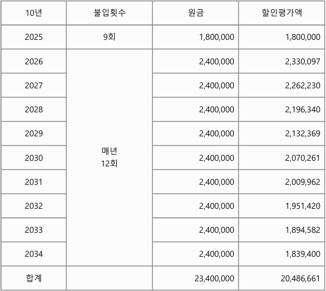 2,000만원을 초과하게 되니 증여세가 나올것이라 생각하기 쉽겠지만, 1년차를 9회만 납입하여 원금을 180만원으로 맞추고 이후부터는 20만원씩 납입하게 되면 총 3%의 할인율을 적용하여 10년간 평가액의 합은 총 20,486,661원이 됩니다.
